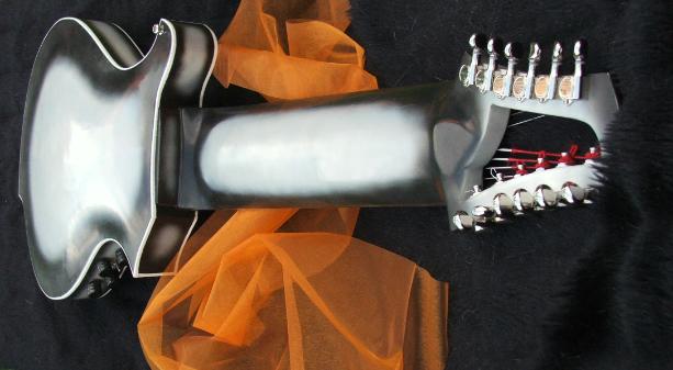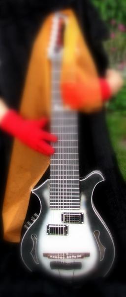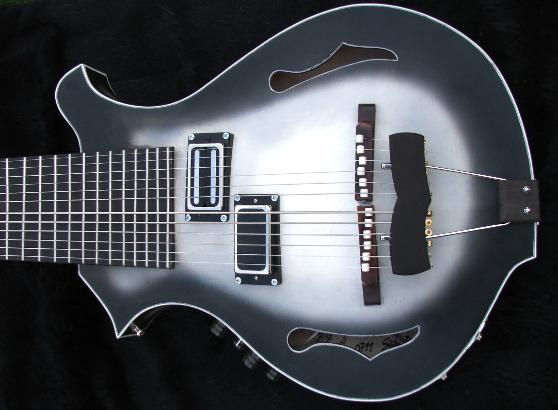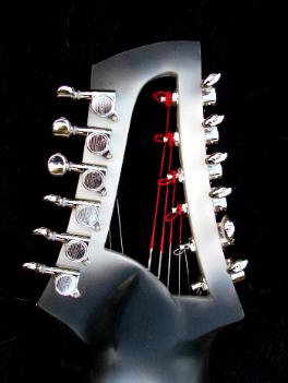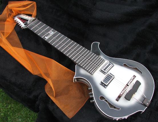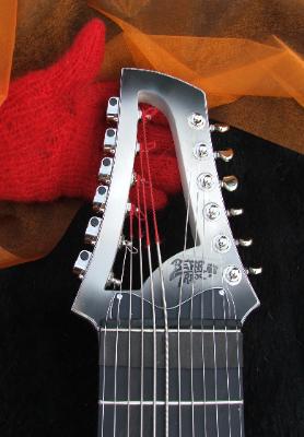 12 strings tuned in 4ths 2 groups with 6 strings scale: 30" neck: maple, glued in, 2 2way trussrods inside head: special designed open BEARTRAX headstock for more convinient reachable tuners and less weight closed kluson tuners schaller straplocks fretboard: ebony, with husky inlay, nickel silver frets bridges: custom made, with individual adjustments for each string tailpiece: custom made, ebony / nickel body: maple back and sides, spruce top with crossed bracing. -all solid woods- finish: nitro cellulose, 3 tone husky colour, satin electronics: schaller pu and duesenberg bass bucker, both with retro nickel-silver covers tone and vol. pot for each pu. wooden control knobs mono/stereo chanal switch, 2 individual outs |