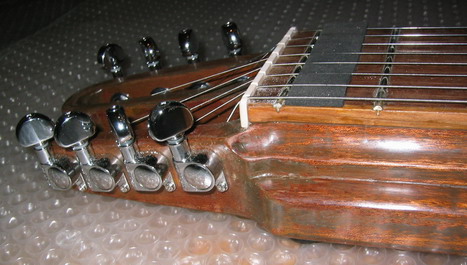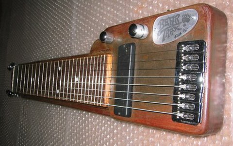 TAP build 2004 8 str. 26" scale 25 frets damper on the 1th fret tuned: E-A-D-a-d-g-c-f also possible: E-A-D-G-C-F-Bb-Eb body: mahagony fretboard: acacia, maple binding, finished with dot inlays on top and sides electronics: 1 active MEC Soab Bar 1 vol. pot 1 active treble pot 1 active bass pot (stacked) 1 mono out finish: nitrocellulose, worn antique brown |